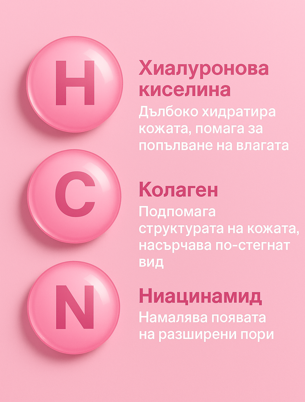 Aily Beauty комбинира хиалуронова киселина, колаген, ниацинамид, глицерин, витамин C и мощен антиоксидантен комплекс. Тази формула осигурява дълбока хидратация, стимулира естествения синтез на колаген и защитава кожата от оксидативен стрес. Кремът изглажда фините линии, стяга структурата и възстановява равномерния тон, придавайки на кожата свеж, подмладен и сияен вид.